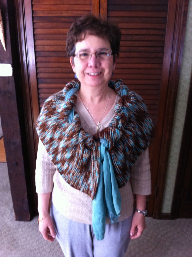 This scarf, with an eyelet edging for weaving another scarf through, took a number of years to make but I finished it up last March.