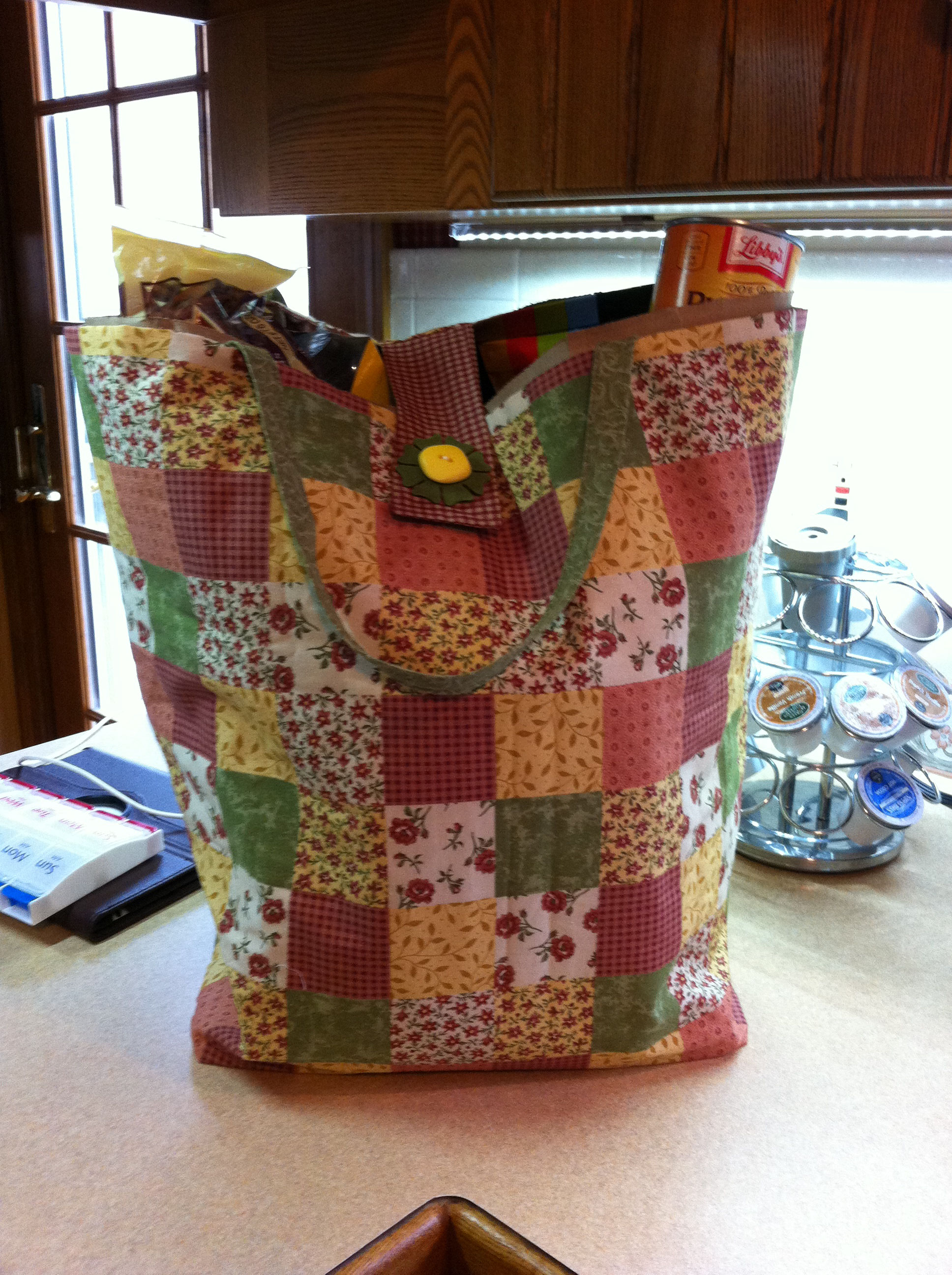 I made a bunch of these for the craft fair, but I only sold one. I designed them to go over a brown paper bag. I love them for me.