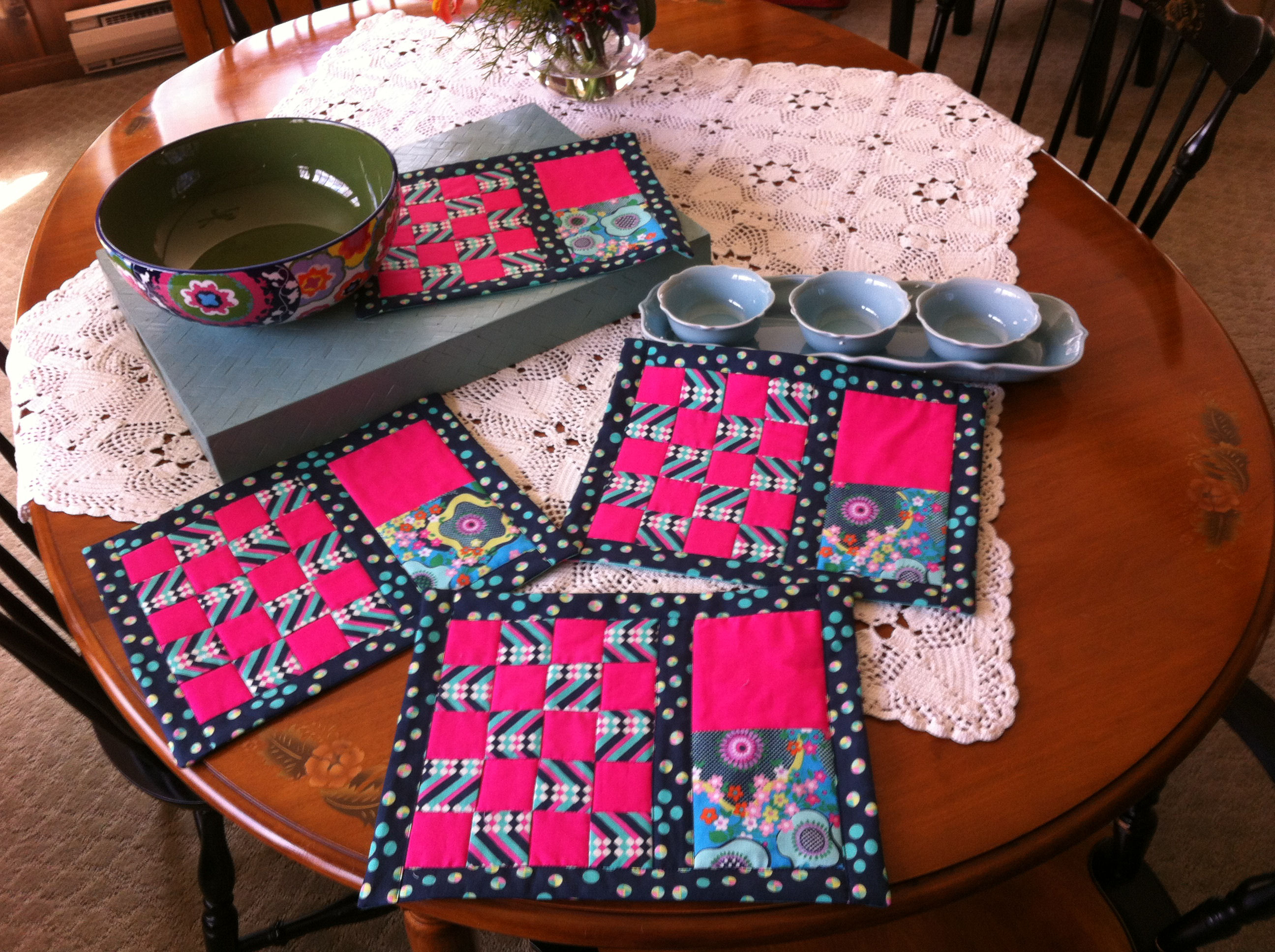 Mug rugs are the latest craze — they are sew much fun to make. I made this for a shower gift. The fabric coordinated beautifully with some of her dishes requested on the registry.