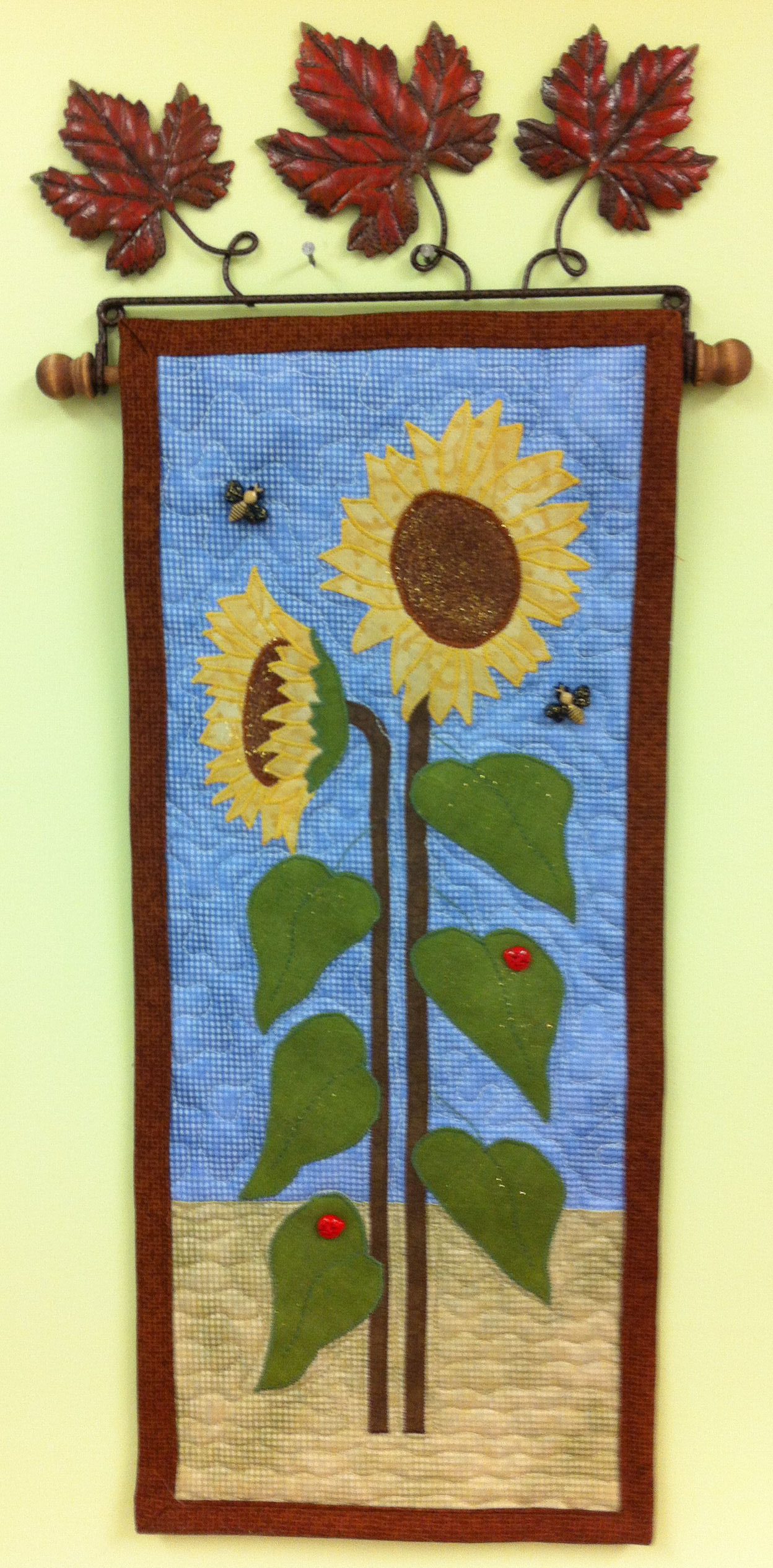 I had some sunflower applique pieces leftover from making the McLean Quilt. I made good use of them by making a little wall hanging and then sold it at the craft fair!