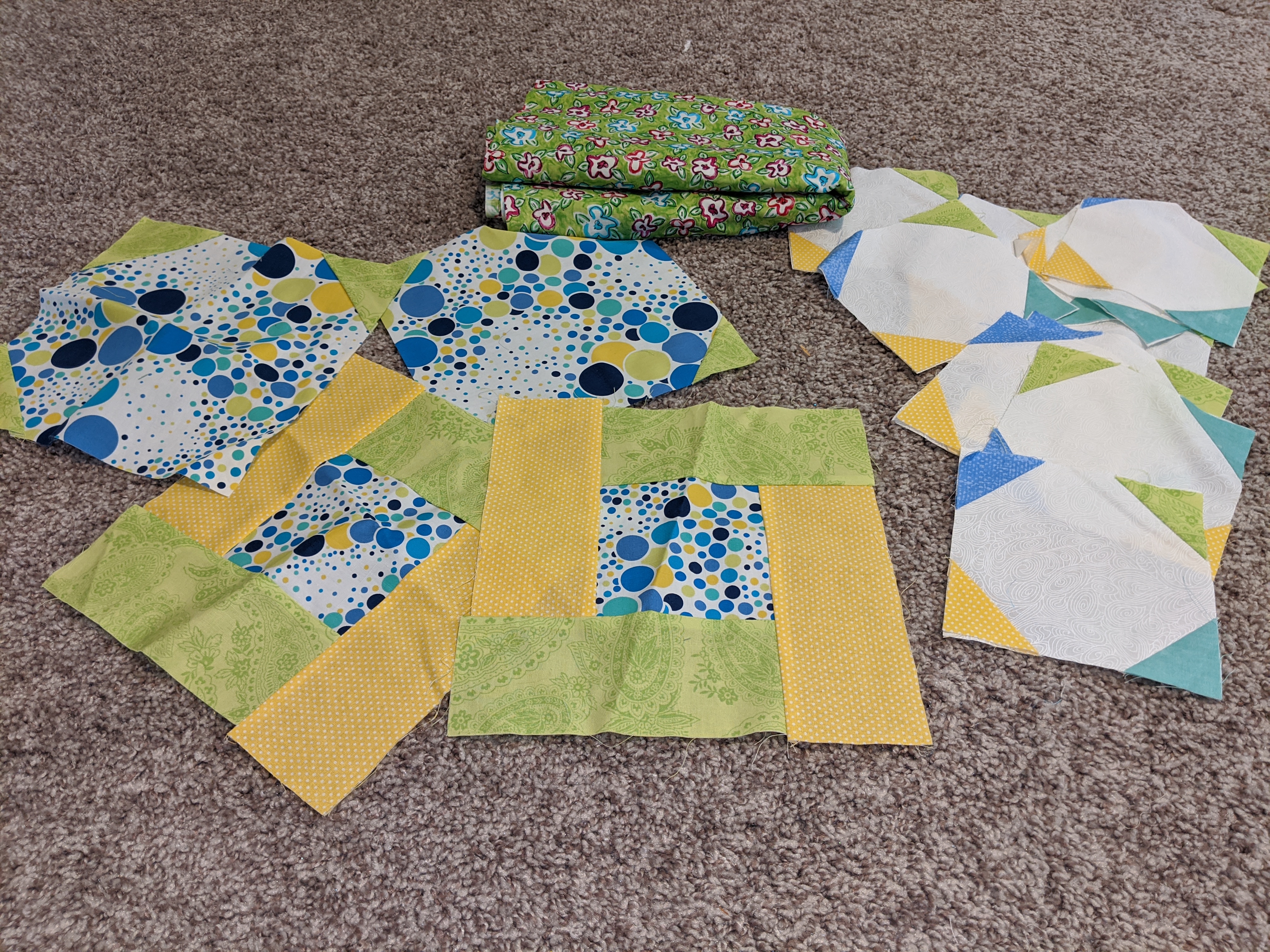 These blocks were left over from a baby quilt I made for my great nephew. I pulled the green with pink and blue flowers from my stash to frame it all up.