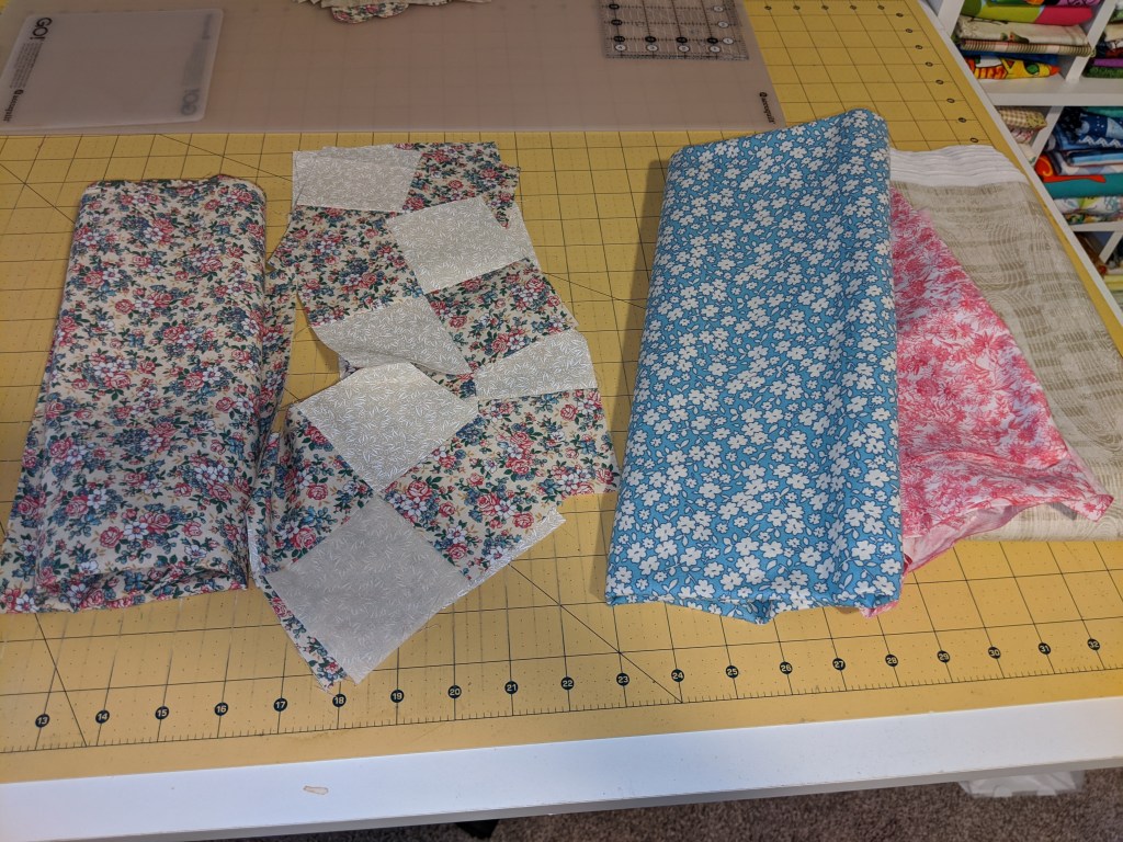 These 4-patch blocks created from the small floral print is so old that I cannot remember what I originally made from it. Being that I’ve had the fabric for many years, it was very difficult to match it up with other fabrics. Colors and trends change over time, which is why experienced quilt makers are able to date quilts. The blue and pink I pulled from my stash are depression-era reproductions, but even those do not quite match up. The beige is a fairly recent purchase. Despite my color-matching challenges, I decided to persevere and hope for the best.