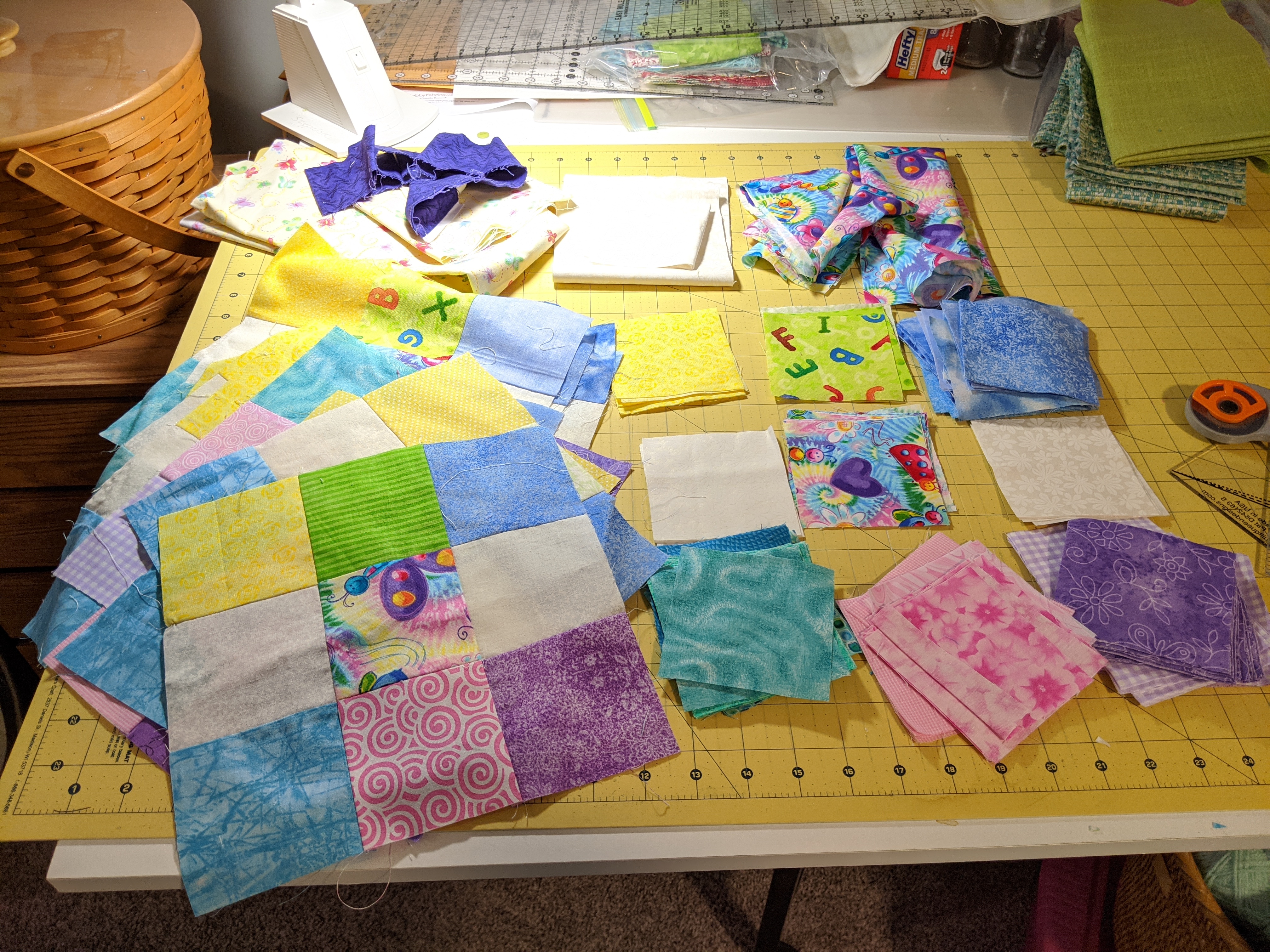 Lots of squares and nine-patch blocks leftover from my Rena-Bean Babies’ group in Connecticut. We created many quilts for needy babies. I tried to make the patterns as easy as possible for the group, comprised mostly of minimally experienced stitchers. However, as I stated earlier, I wasn’t looking for simple during my Pandemic Progress work. This was a job for the X-Block!