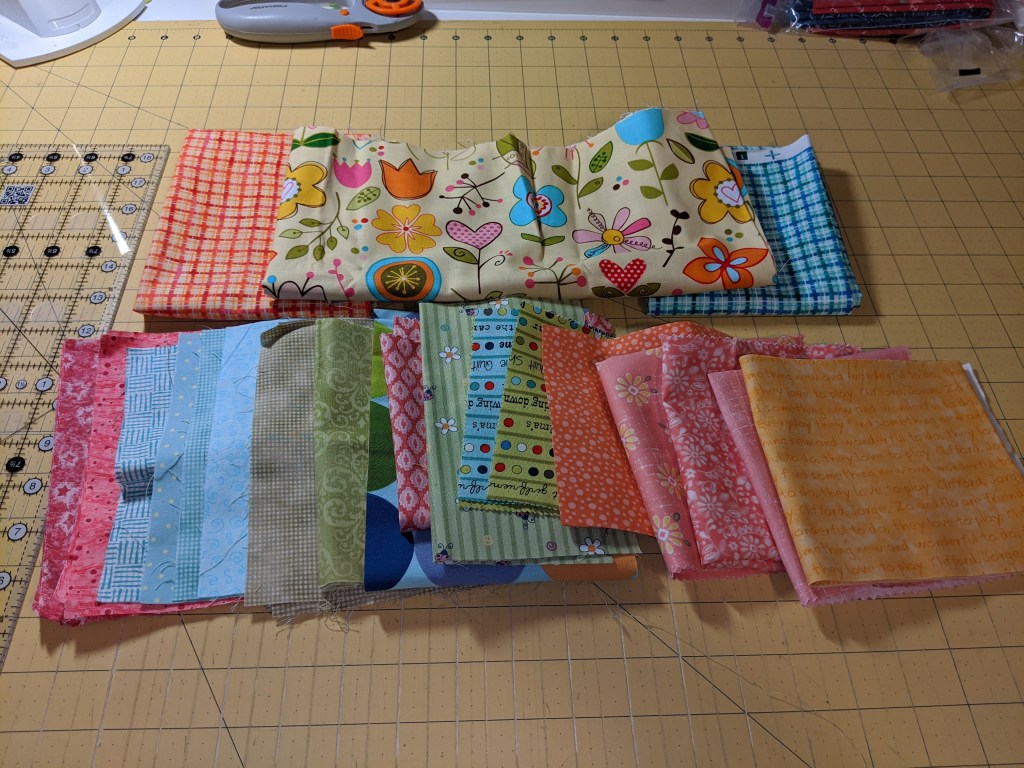 These little pink and green squares were left over from something . . . I have no memory of what. I stitched the squares together and then placed it in quarantine. I wanted to play with my new AccuQuilt cutter, so . . . .