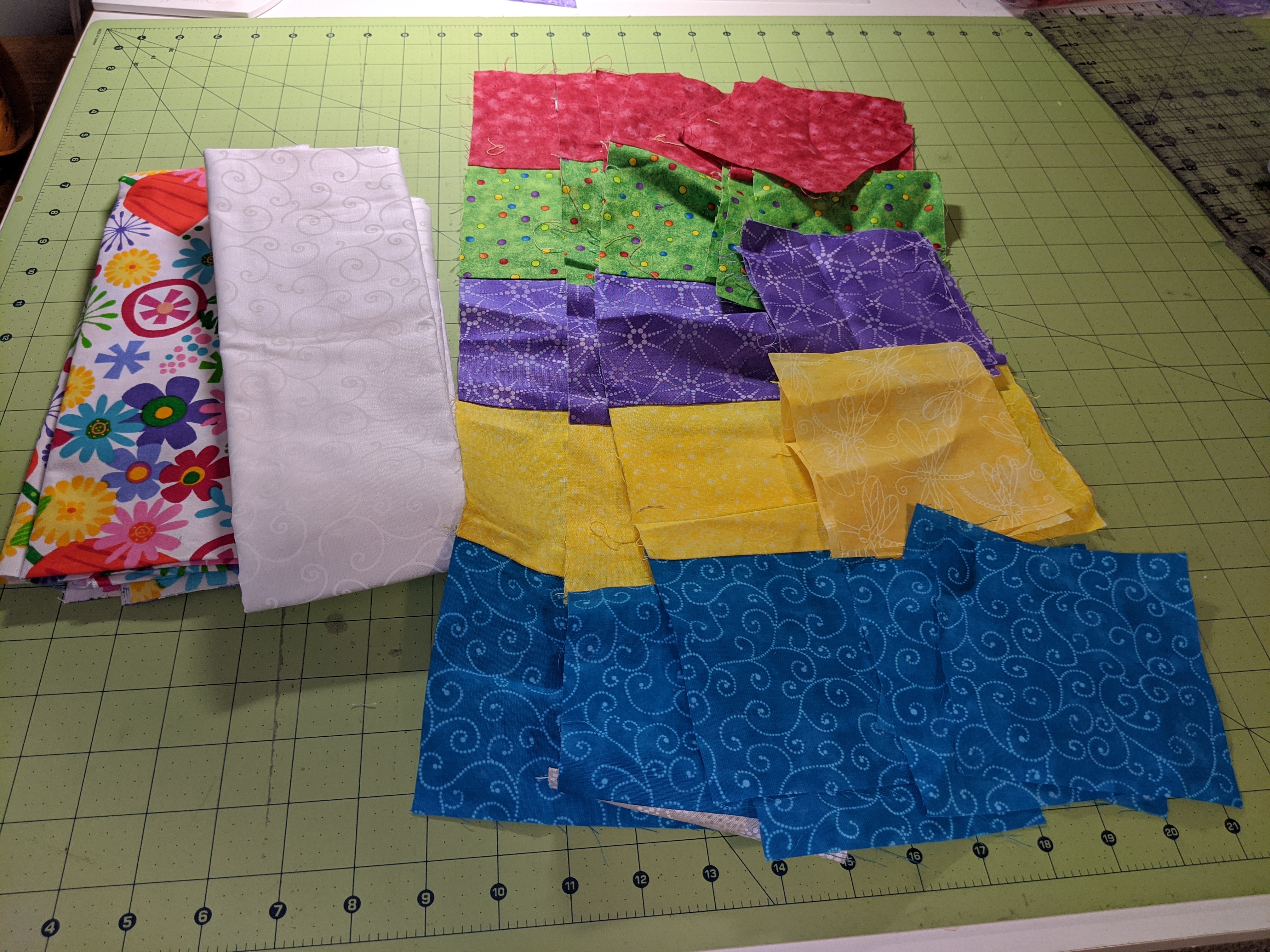 These primary color strips were left over from a baby quilt. Most of the blocks were already stitched together into strips of five colors. I pulled the floral and white out of my stash. I had some fun with these and I made them go a long way!