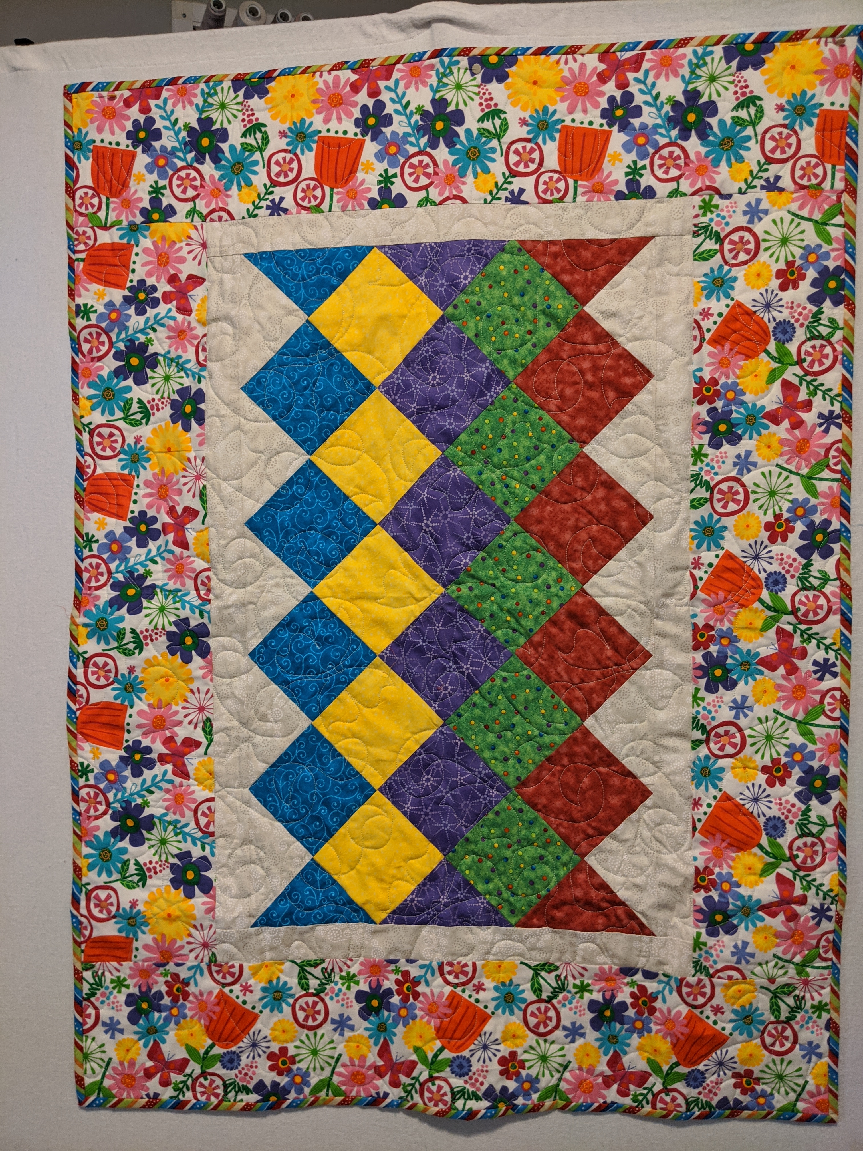 The flower print plus the orange and blue plaids were left over from a baby quilt I made for a friend. The variety of colors in the flower print was a perfect opportunity to do one of my favorite patterns — The Lil’ Twister. It’s also a great way to use up small scraps.