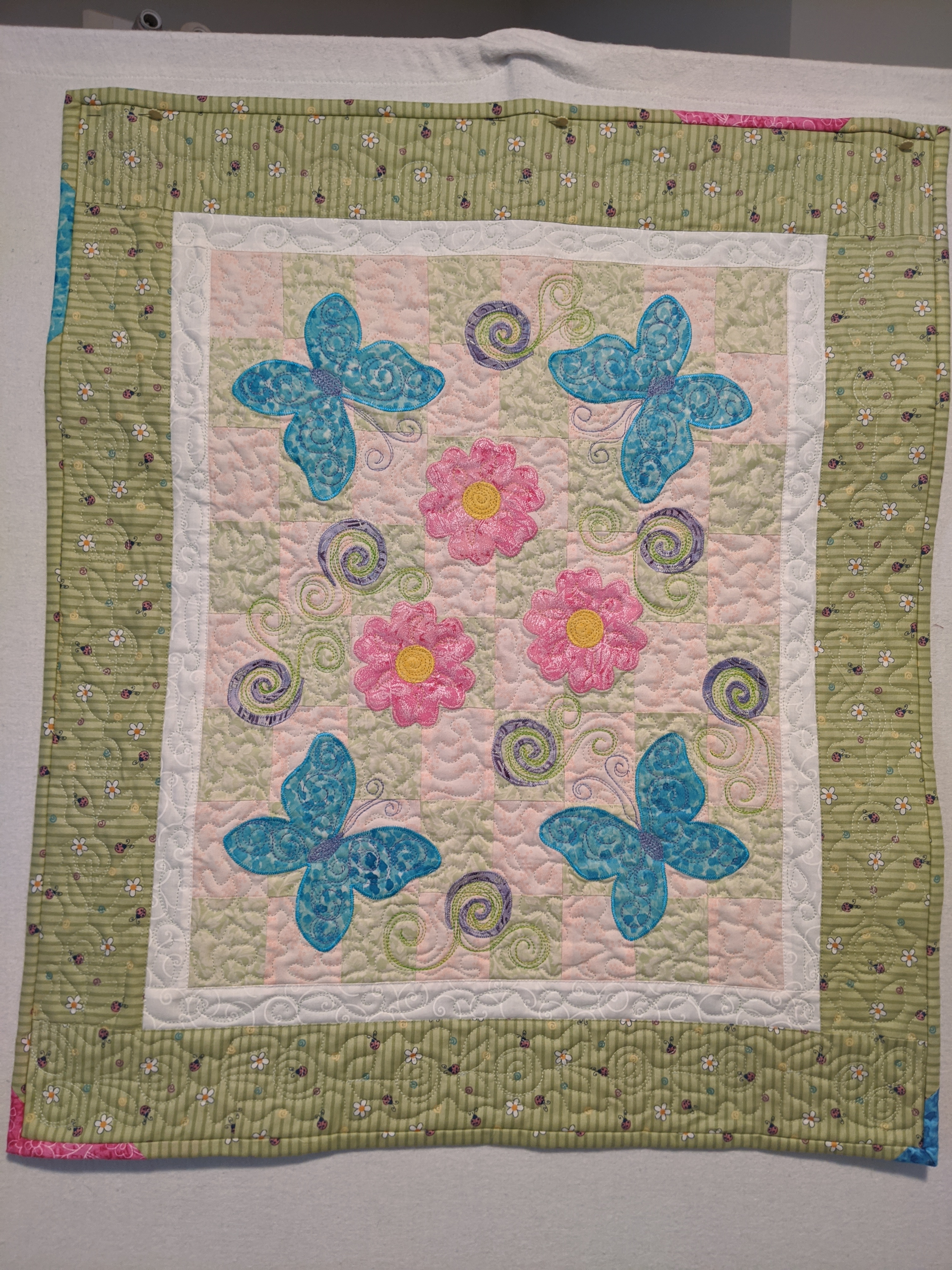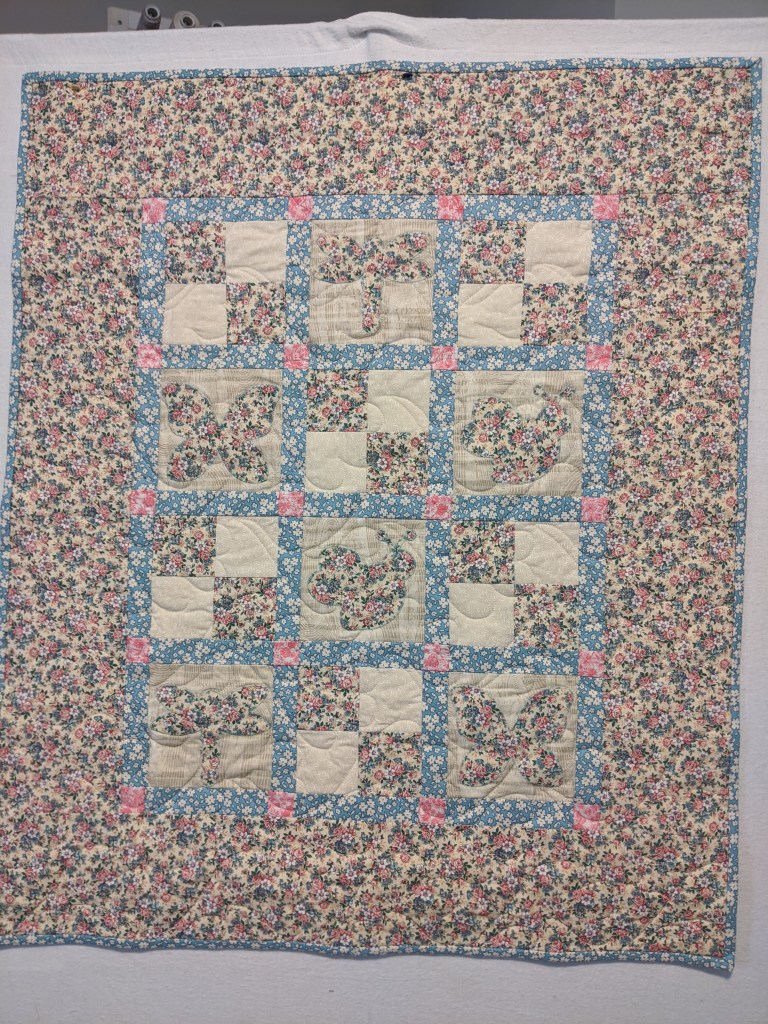 Not too bad! I decided to make use of my AccuQuilt Cutter by cutting out butterflies, bees, and dragonflies. I auditioned many other fabrics for the appliques, but nothing worked. Using the floral was truly the best option, unless I were to break my commitment and purchase new fabrics. Though this is not as exciting as my other left-over accomplishments, I do like the antique feel of this quilt.