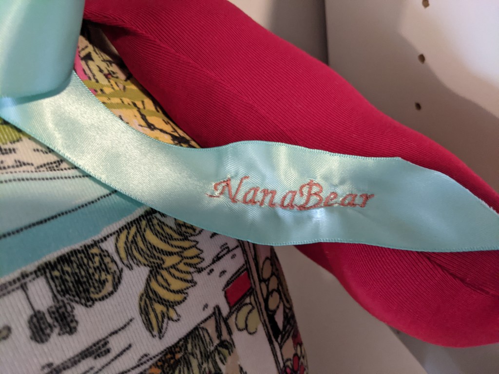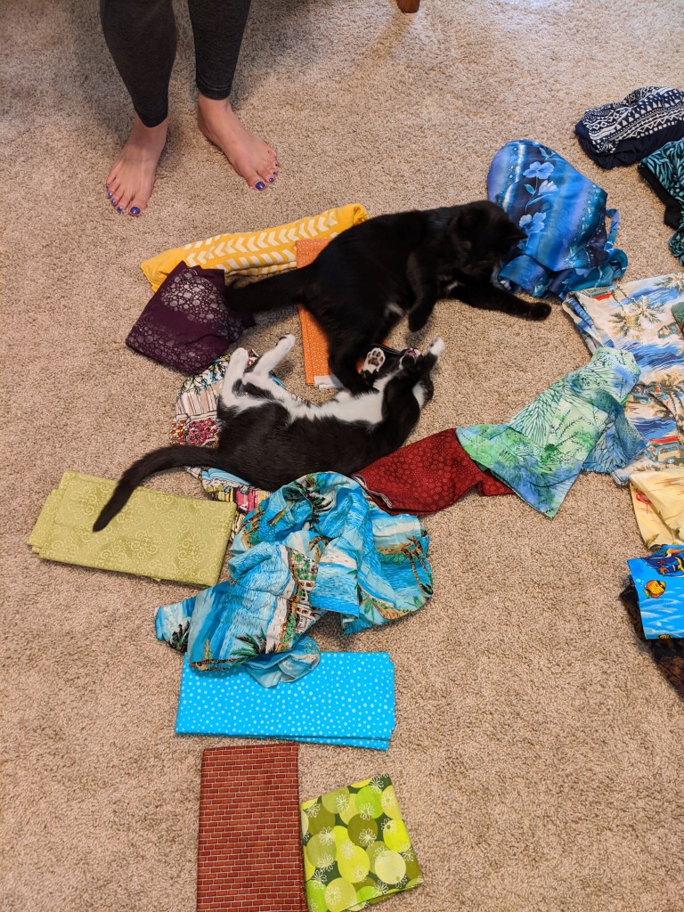 A great scrappy creation. Even my binding used up the last bits and pieces!When sewing at my daughter’s home (those are her feet), there is never a shortage of helpers as she usually has a few foster kittens ready to check out our work. This pile is a mixture of my friend’s clothing, some of her fabric stash, and some of my stash. Sadly, she passed away in February 2020, before Co-Vid. She has three small grandchildren, who will not know their wonderful grandmother. Robin and I decided to take her leftover fabrics and some of her colorful clothes to create something of comfort for these children. We incorporated bits of my fabric where needed to balance out the colors.“Nana Bears!”“Once my clothes and now your bear. Cuddle it close and feel me there. I will love you ALWAYS! Love, Nana”